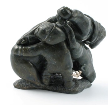 Johnny Aculiak's favorite medium is soapstone and one of his favorite subjects to carve depicts an Inuk hunting game; As for his favorite subject matter, he said: "I like carving Inuit people. I used to get requests from teachers who wanted me to make something specific for them. I would always try even if I had never made it before. Mostly they wanted birds. I was already being told that I was a good carver, even when I had no idea of how to price a carving."
