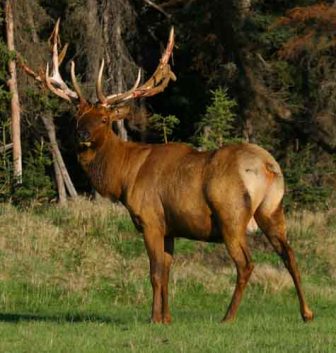 Elk share many similarities with moose, deer and caribou. They are usually smaller than moose and larger than deer or caribou. Bulls (the males) stand about five feet tall at the shoulder; cows (the females)are about six inches shorter. The legs and neck of elk are usually darker in color than their body. Elk also have a distinctive light beige or yellow patch on their rump. Elk calves are born in late May or early June when abundant food is available for the mother and the mild weather increases the calves' chances for survival. Birth usually occurs under the cover of dense spruce forests, hidden from predators and protected from the elements. Calves are born with protective coloration (light spotted areas on the back which act as camouflage). A few days after giving birth, the mother joins other cow elk with calves. A single cow will often “babysit” with the calves while the remaining cows seek food. As summer progresses, elk bands move above timberline and feed on the alpine slopes where breezes keep biting insects at bay and young plants are highly nutritious. By July, the calves, although still nursing, begin feeding on succulent forbs. Newborn elk calves start outweighing about 35 pounds. Adult bull elk on Afognak Island can weigh up to 1,300 pounds! An elk’s top two canine teeth are called ivories. Though smaller than they used to be, scientists believe they aret he remains of saber-like tusks that elk used long ago for fighting. A hundred or so years ago, there were only six land mammals on islands of the Kodiak Archipelago: tundra vole, shorttailed weasel, little brown bat, river otter, red fox and brown bear. Because people wanted animals to hunt for meat, they introduced Sitkablack-tailed deer and elk. Elk need lots of food to survive! Elk are hardy animals whose large body size and herding tendencies require tremendous amounts of food. From late spring to early fall with a wide variety of food available, elk are mainly grazers, using grasses, forbs, and other leafy vegetation. By late fall they become browsers, feeding on sprouts and branches of shrubs and trees. The elk can become its own worst enemy as large herds often damage their food supply by excessive stripping, trampling, and overcropping of staple food plants, including willow and elderberry. For this reason, it is important to keep elk herds from becoming too large in relation to the available food supply.